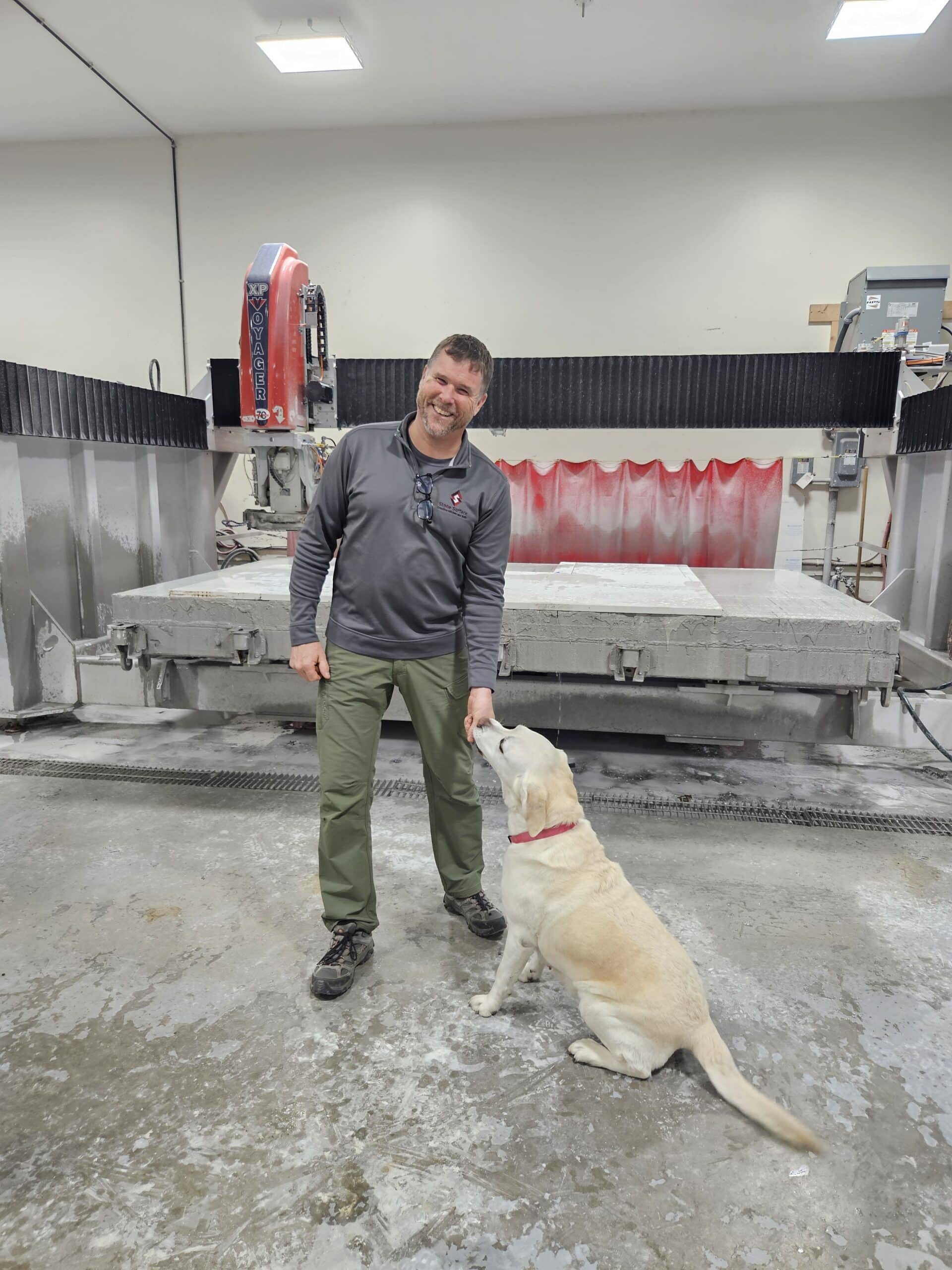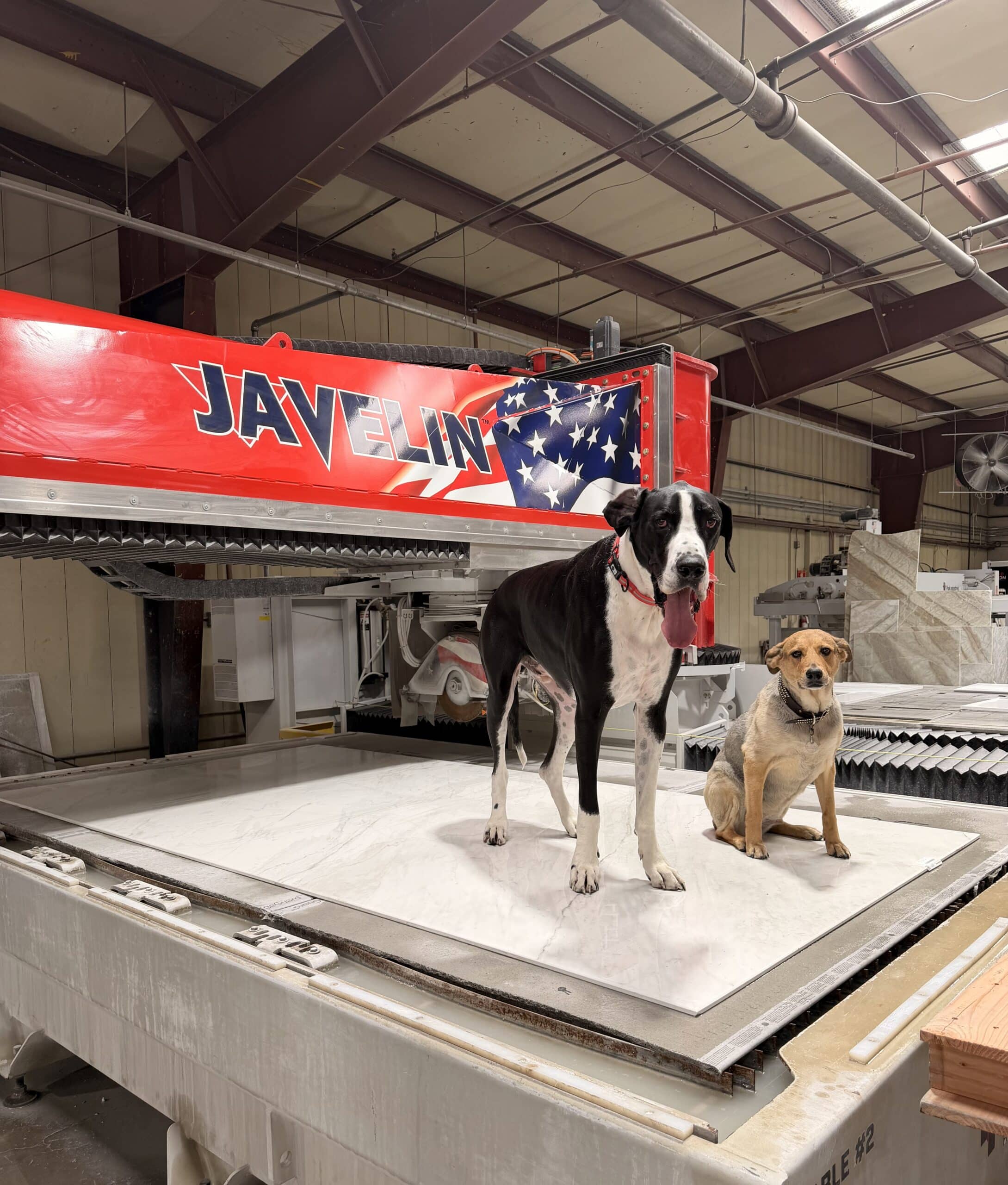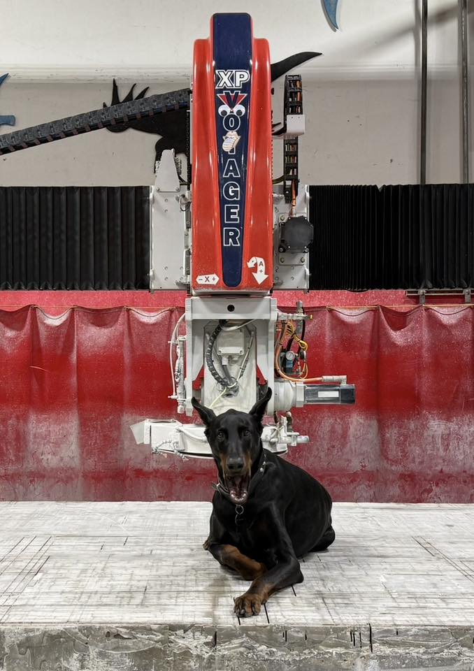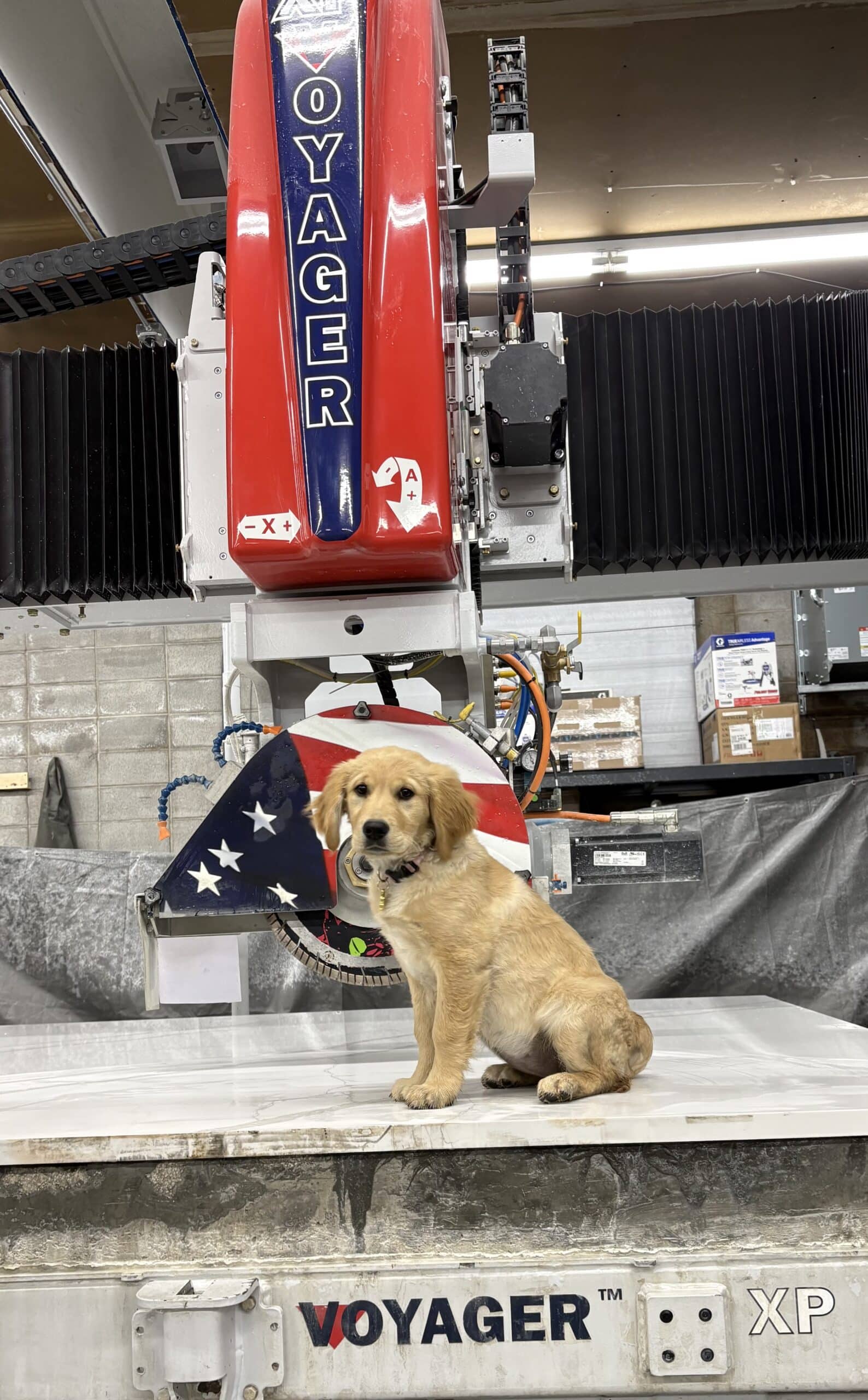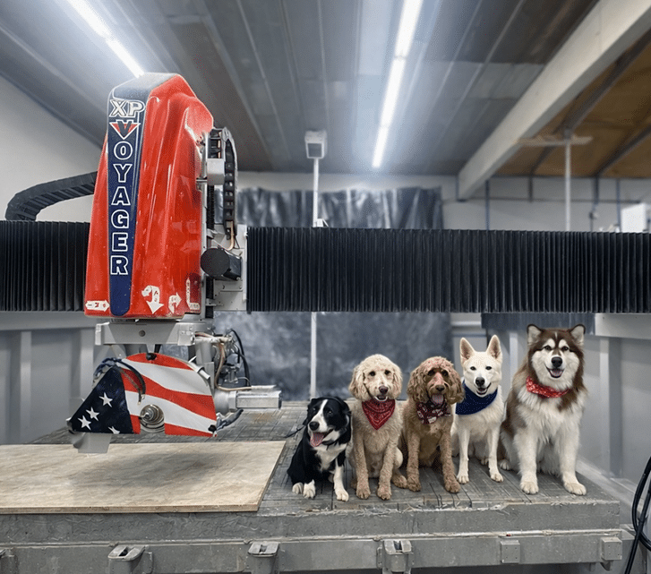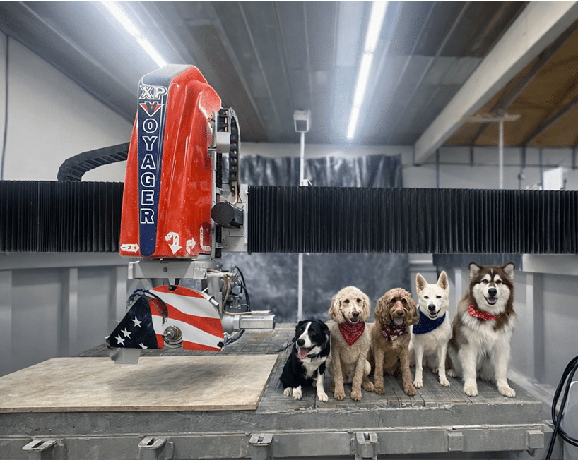 Captain, Eli, Molly, Willow, and Khaleesi of Mountain Marble & Tile stole the show as a team, posing together on a VOYAGER XP CNC Saw and proving teamwork really does make the dream work.