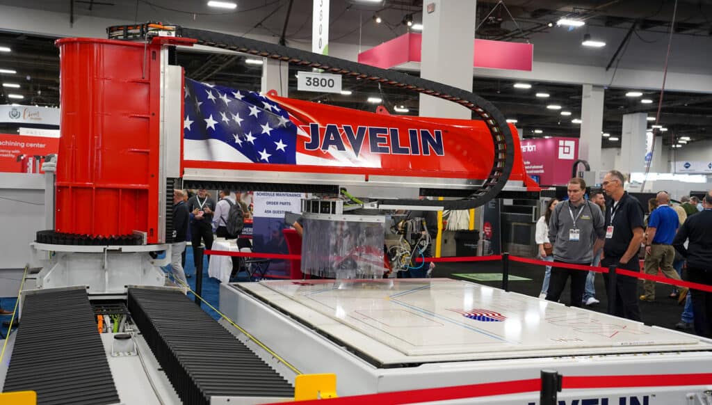 Booth #3837 played host to an impressive display of state-of-the-art machinery from North America’s premier manufacturer. The JAVELIN CNC Sawjet, TITAN 4700 CNC Router, FASTBACK II Edge Polisher and HydroClear Pro 400 Water System took center stage for attendees to see live in booth.