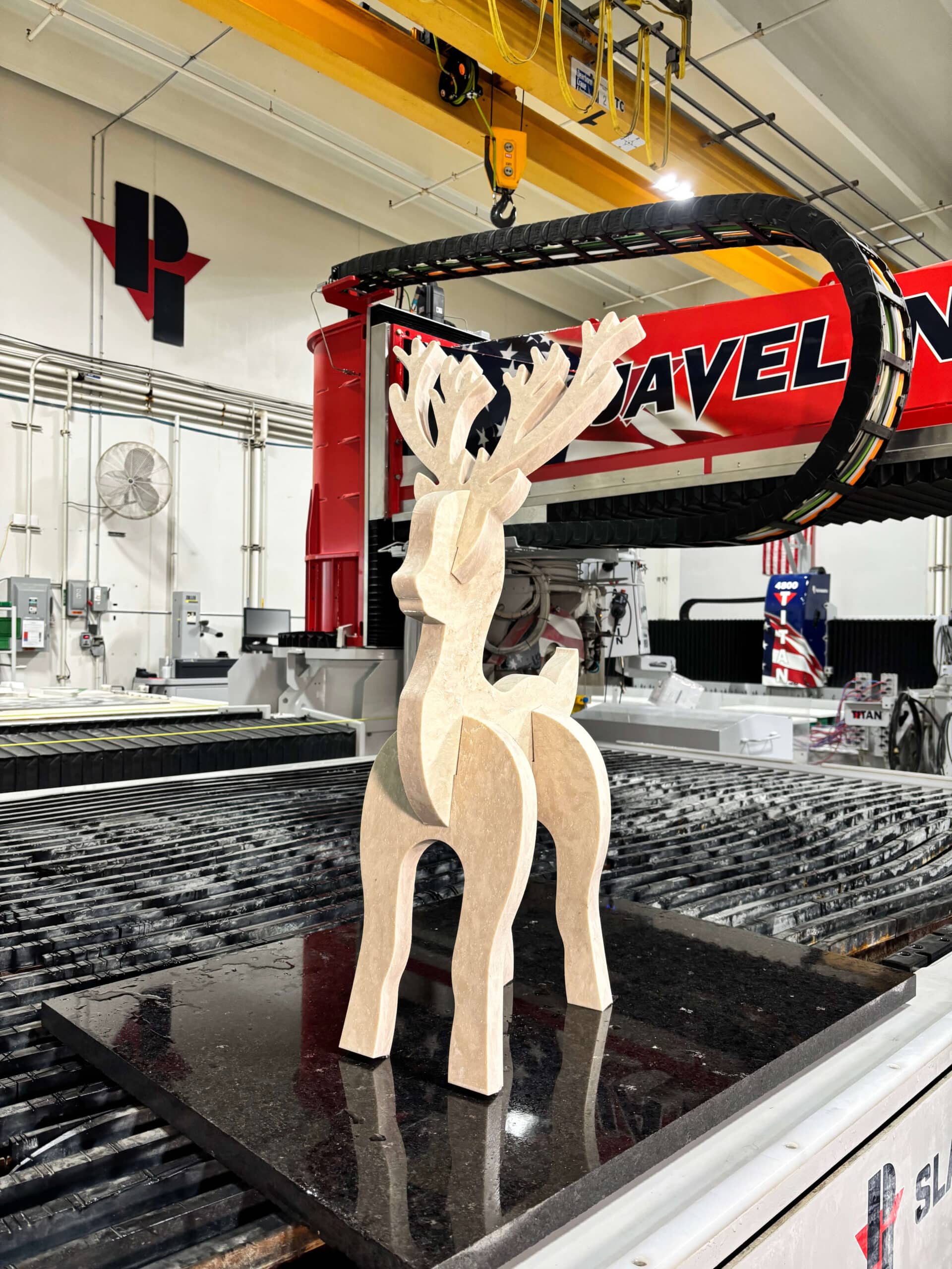 Next up, it’s time to let the reindeer take shape. The reindeer is fully cut using the waterjet, allowing the JAVELIN to handle every curve and detail with precision. Thanks to the sawjet’s accuracy, this festive favorite comes together cleanly and efficiently, no extra steps required.