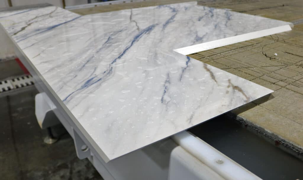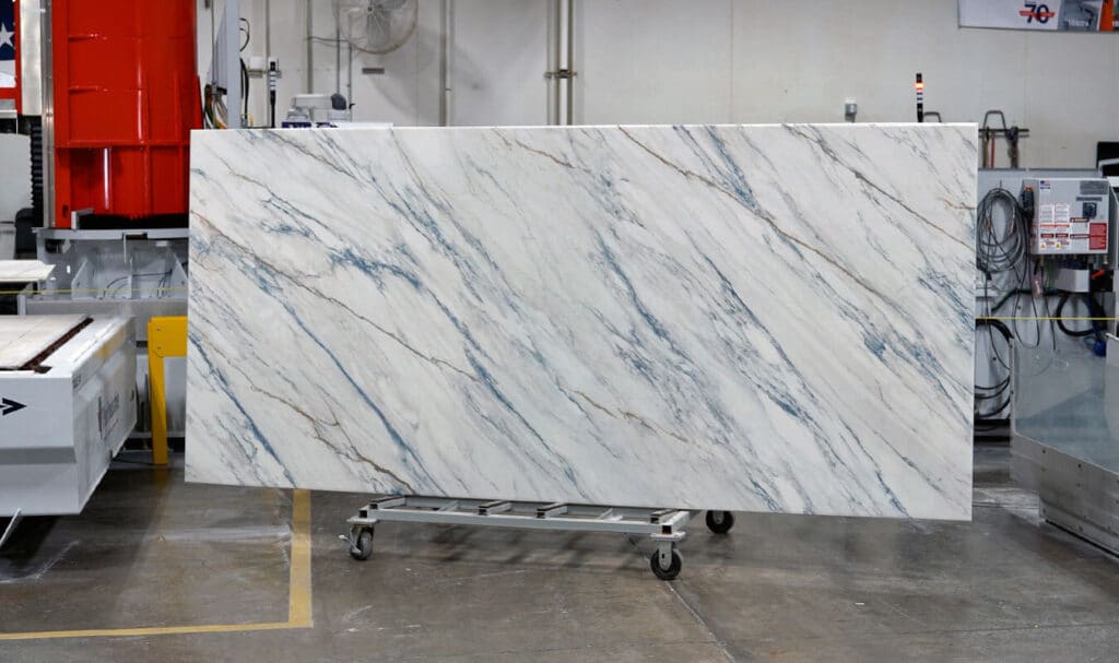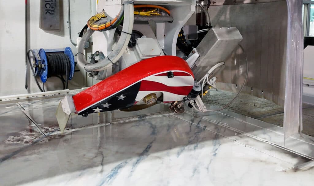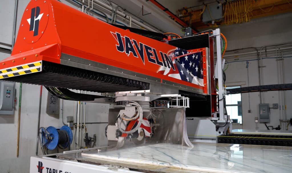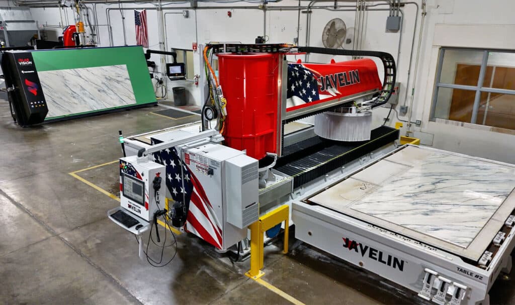 Once the layout and programs are created, the JAVELIN CNC Sawjet takes over. In about three hours, it slices through three 2cm Dekton slabs—executing over 250 total cuts, including 117 miters (70 blade, 47 waterjet)—with incredible accuracy and cut quality. Its Ultra-Compact Automation feature automatically adjusts/optimizes feed rates for ultracompact materials like Dekton, while the 27 HP arbor motor and AccuCut™ System deliver unmatched power and precision. And with its dual-table design, operators can unload and reload slabs while the other table cuts—meaning zero downtime between jobs. While it is a high-production beast, the JAVELIN shines in high-end custom fabrication, proving why it’s the industry’s most versatile and capable sawjet for any level of work.