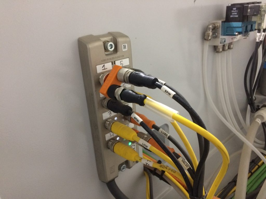 Connect the T-coupler to port 1 on the 8-port block on the back of the bridge, connect the wire that was in port 1 to the port labeled “B” on the T-coupler and the wire from the end of cycle prox will be connected to port “A” (on some machines port 1 may be on the bottom instead of on top)
