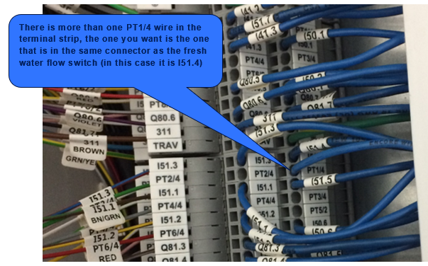 • There is more than one PT1/4 wire in the terminal strip the one you want is the one that is in the same connector as the fresh water flow switch (in this case it is