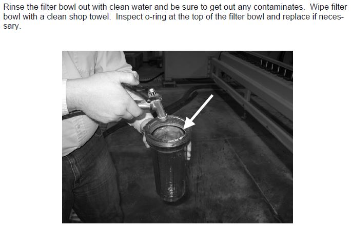 The CNC has filters that are designed to act as a safety device to prevent damage that may occur in the event that the air and water filter systems fail. It is a good idea to catch impurities or contaminants upstream at the source before they get to your CNC machine. If filters are plugged more often than expected, evaluate your air and water systems upstream to find the source of the problem. The machine filters are not intended to be part of the shop air and water system but rather a safety net in the event of a failure upstream.