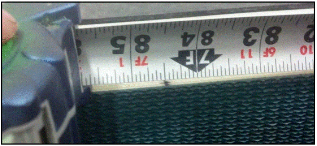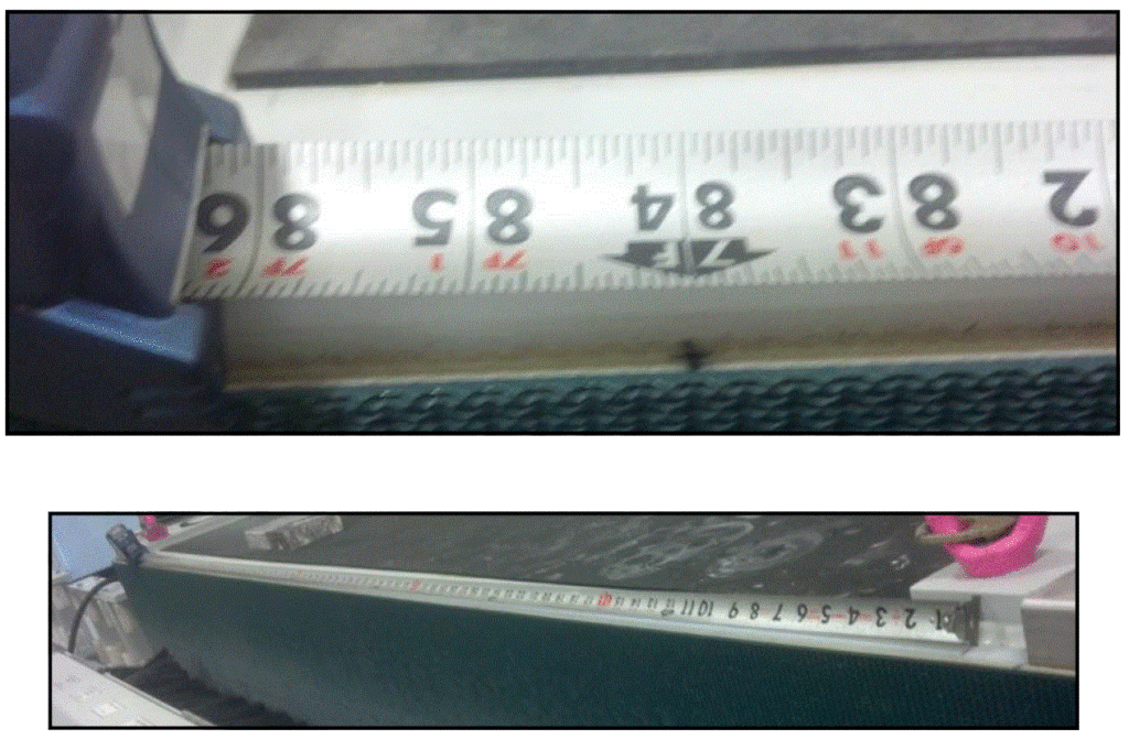- Tighten the two (2) belt tension bolts evenly until the difference between the marks on the top of the belt reads 7′ – 5/8″. Check the distance between the two marks made on the bottom of the belt and verify the same 7- 5/8″ measurement.