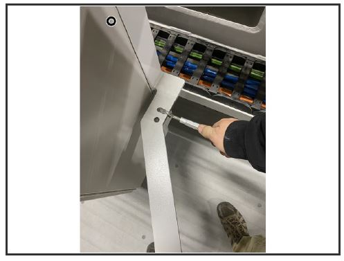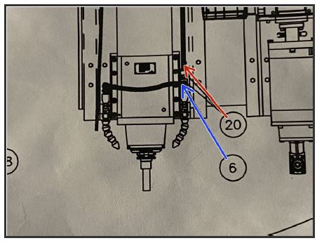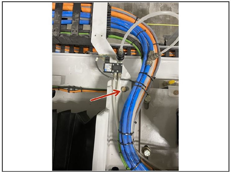 - On the bracket where the cross-travel cable carrier attaches remove the bolt closest to the cable carrier 9/16″ wrench.