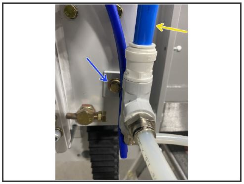 - Remove the 5/8″ supply line. Pull this line back to the cross travel by cutting the tie straps that hold it in the water line bundle.