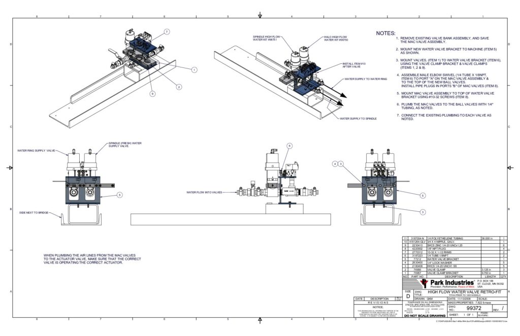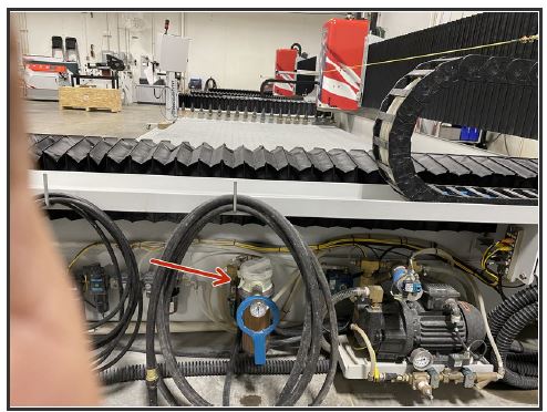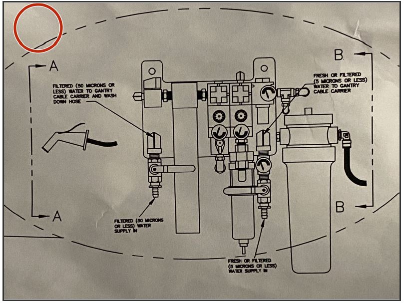 - Run the 30 foot line through the gantry cable carrier to the new ball valve. Connect the other end of the hose to point A on the ball valve.