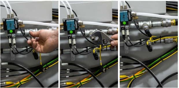 Apply sealant to the sensor’s threads; screw it into the tee.