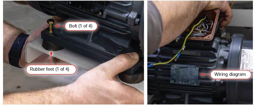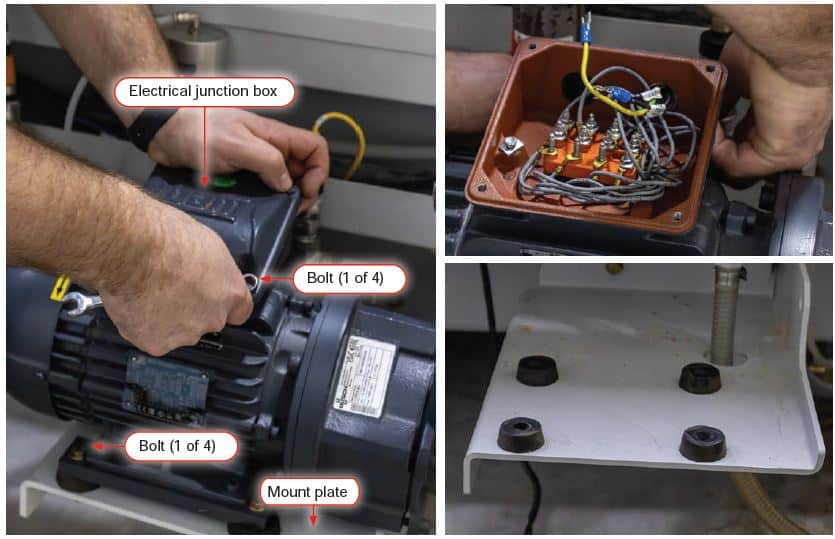 Pass the bolts through the pump, rubber feet, and mount plate; attach and tighten a nut onto the bolt’s threaded end to secure the new pump to the machine.