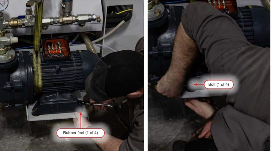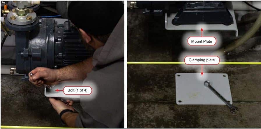 Pass the bolts through the pump, rubber feet, mount plate, and clamping plate; attach and tighten a nut onto the bolt’s threaded end to secure the new pump to the machine.