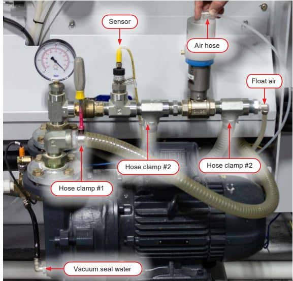 The regulator should read 10 psi or 3 gallons per minute from vacuum pump discharge