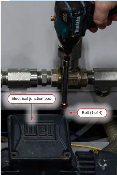 Remove the 4 bolts securing the pump to the mount plate; after the final bolt, catch the clamping plate attached to the underside of the mount plate.