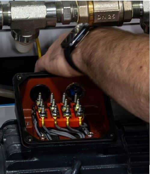 Quick cycle the pump on and off to confirm a clockwise rotation of the motor: Watch the fan on the end of the motor. The arrow sticker on the fan shows the proper motor rotation.