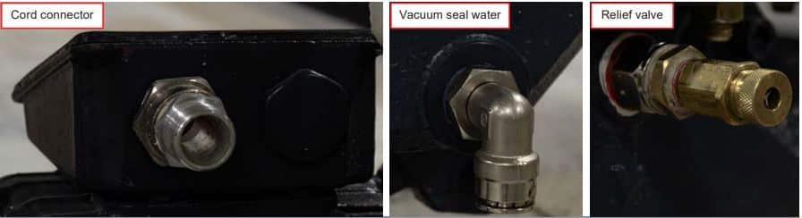 Attach the manifold, discharge assembly, relief valve, vacuum seal water, cord connector, and gasket to the new pump.
