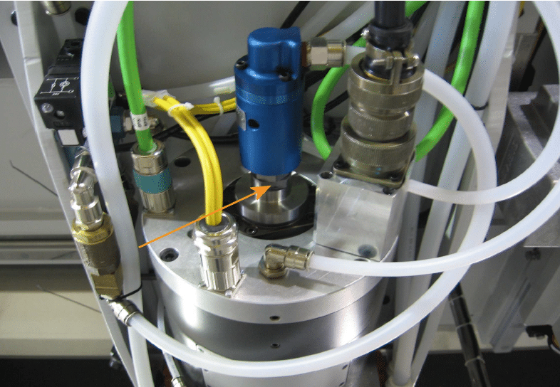 Install the clamping set by placing it on the Allen wrench, apply Meta Flux, pressing the Tool Release button, inserting it into the spindle opening and turning clockwise (looking up) until it feels tight. Release and repress the Tool Release button 10 times and recheck for tightness with tool release button pressed.