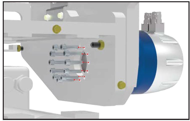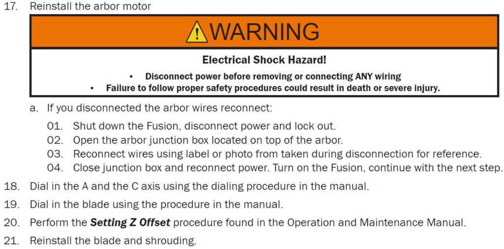 - Reconnect power and turn on the fusion, continue with the next step. Angle the arbor a with the wires on it so it will be out of the way to remove the inside bolts.
