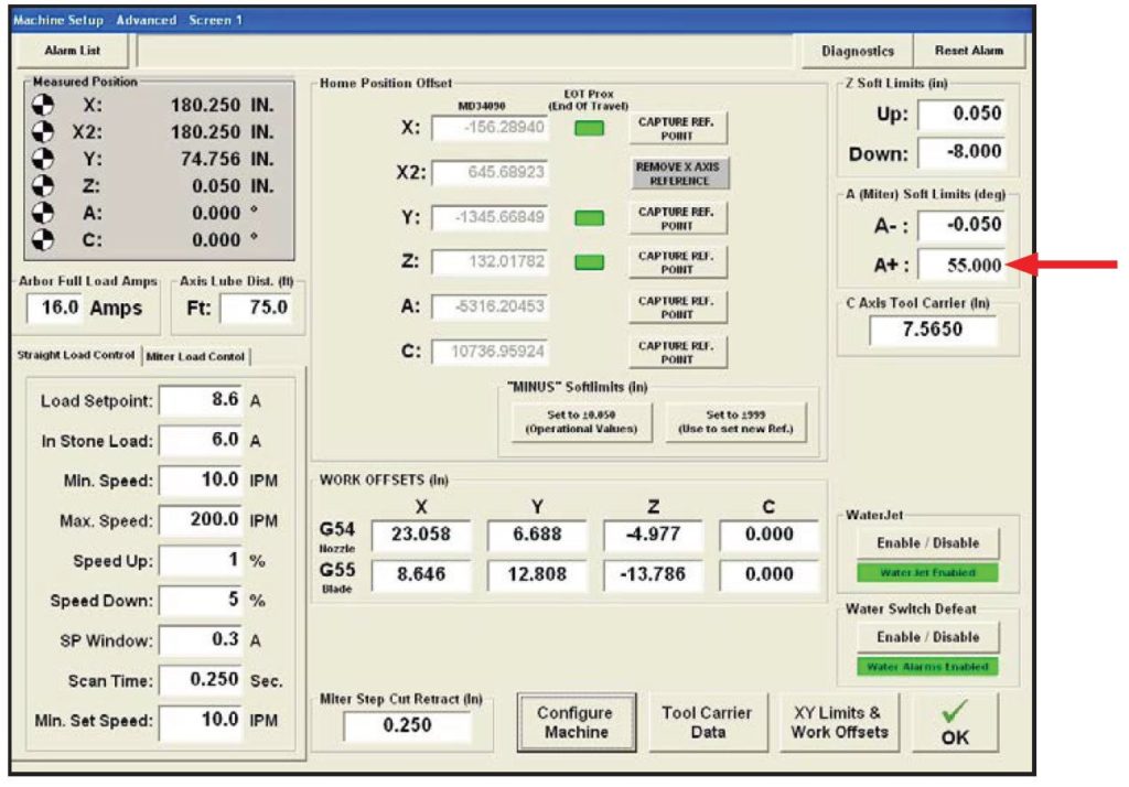 At the operator station open the Advanced Setup Screen 1 and change the A+ miter limit to 55 degrees