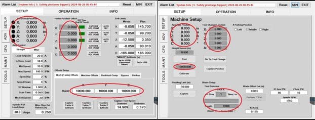 - In the Machine setup screen the nozzle calibration will be 10000.000 and the blade length will be at 0.000