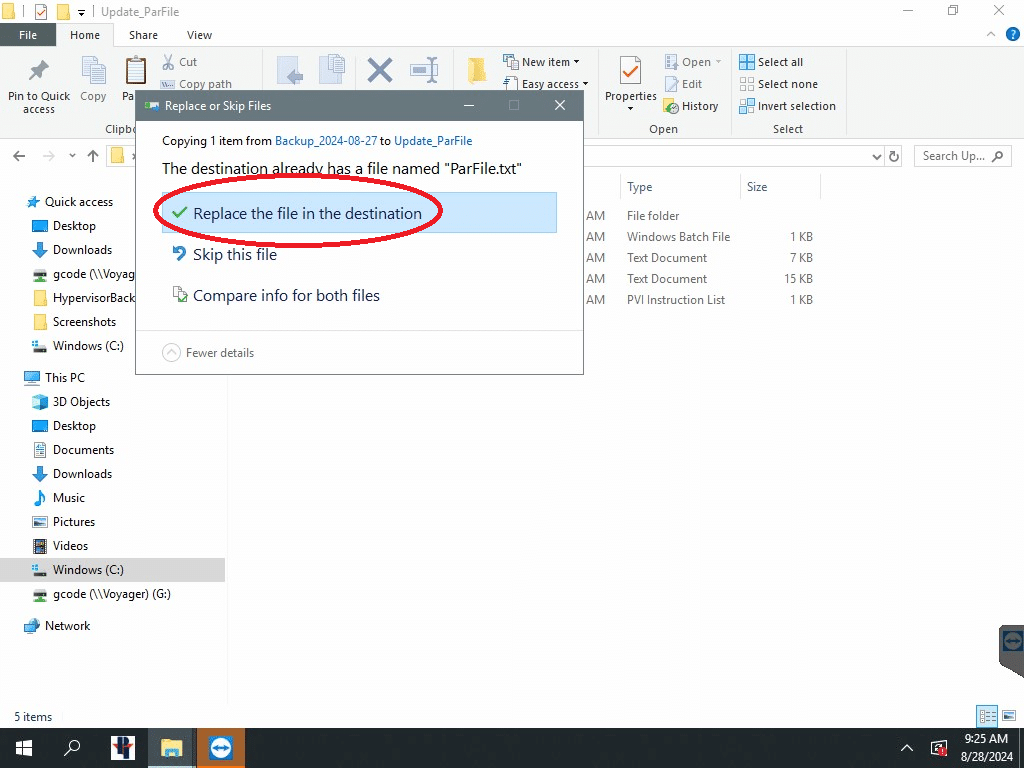 If you already have an old par file in this folder it will ask you if you want to replace it. Select Relpace the file in the destination.